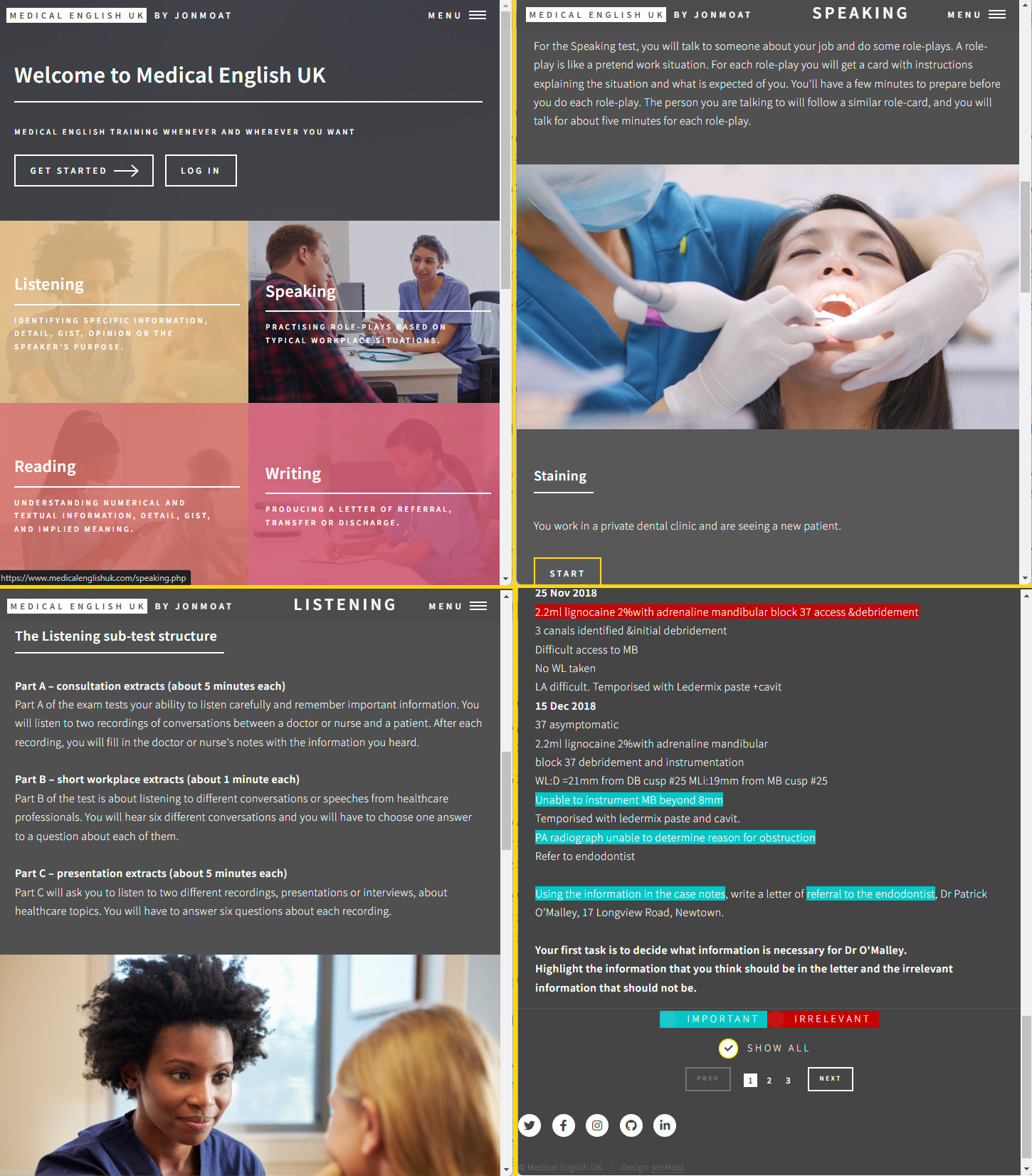 Role: Sole DeveloperCurrently working on a web app for students studying for the Occupational English Test, which is specifically aimed at a broad range of medical practitioners. The app is intended to allow flexibility for students in terms of where and when they study, and to deliver high quality support at the lowest cost.